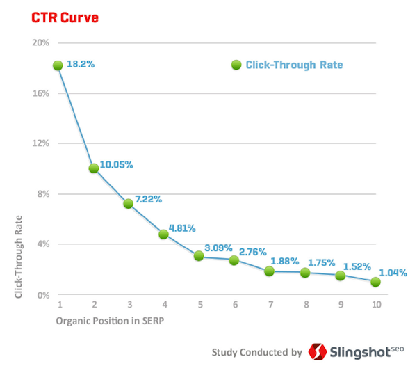 And a 2011 study by Slingshot SEO showed the No. 1 organic position in Google received 18.2 percent of clicks, with the second position at 10.05 percent and the third at 7.22 percent.